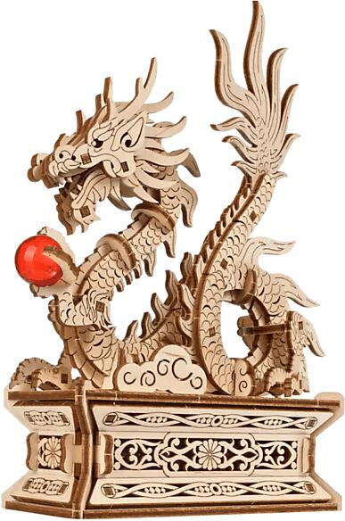 A Sárkány az uralkodás és az udvari hatalom szimbóluma, találtak már sárkányokat ábrázoló leleteket Kínában mintegy 8 000 évvel ezelőttről is. Ellentétben az európai sárkányokkal, melyeket félelmetes szörnyekként jelenítek meg a különböző művekben, a kínai sárkányok a jólét és a szerencse szimbólumai. Gyakran ábrázolják őket egy lángoló gyönggyel a foguk vagy karmuk között, ami az energiát és a teremtést jelképezi. A gyöngy emellett bölcsességet, spirituális erőt és halhatatlanságot is jelenthet. Az Ugears Fa Sárkány modell egy 3D kirakó a szerencsét hozó sárkányról, mely egy lángoló vörös gyöngybe kapaszkodik. A hosszú, tekergőző, négy végtagú sárkány megjelenését a kínai művészeti ábrázolások inspirálták. A sárkány egy különleges állványon ül, amelynek rejtett fiókja kinyílik, ha megnyomsz rajta virágnak álcázott titkos gombot. Amennyiben neked úgy jobban tetszik, a Sárkányt le is vehete a talapzatról és kiállíthatod önmagában is. Remek éke lehet akár a nappalidnak, akár az irodai asztalodnak. Ha még különlegesebb felhasználási módot szeretnél, akkor rejts el üzenetet, egy jóslatot vagy egy apró kincset a Fa Sárkány alapjába! A modell 141 alkatrészből áll és becsült összeszerelési ideje 2 óra. Az összeillesztéséhez semmilyen ragasztóra vagy vegyi anyagra nincs szükség!
